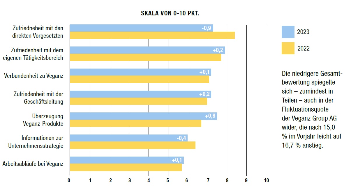 Besser für die GesellschaftAuch die soziale Seite unserer Geschäftstätigkeit liegt uns sehr am Herzen. Deshalb wollen wir transparent darstellen, wie wir die Zufriedenheit unserer Mitarbeiter:innen sicherstellen und uns für ihr Wohlergehen engagieren. Und wie wir dafür Sorge tragen, dass unsere Lebensmittel höchsten Qualitäts- und Sicherheitsstandards entsprechen:Bessere Zufriedenheitswerte Bessere Möglichkeiten für Mitarbeiter:innen Besser Weiterkommen mit Veganz Bessere Gesundheit, bessere Sicherheit Bessere Produktqualität Bessere LieferkettenBessere ZufriedenheitswerteBeim Umgang mit unseren Mitarbeiter:innen sind uns ihre Bedürfnisse und Wünsche besonders wichtig. Deshalb setzen wir auf regelmäßige Befragungen, in denen sich die Zufriedenheit unserer Mitarbeiter:innen im sogenannten „Employee Net Promoter Score (eNPS)“ als wichtigster Kennziffer ausdrückt.So berechnet sich der eNPS:Unsere Mitarbeiter:innen bewerten auf einer Skala von 0 bis 10, wie wahrscheinlich es ist, dass sie Veganz als Arbeitgeber weiterempfehlen würden. Alle Bewertungen von 0 bis 6 werden zusammengezählt und von allen Bewertungen mit 9 oder 10 abgezogen. Die Differenz resultiert im eNPS, der einen Wert von -100 bis maximal 100 erreichen kann.Zufriedenheit unserer Mitarbeiter:innen2023 haben wir insgesamt vier (Vorjahr zwei) breit angelegte Befragungen innerhalb der Veganz Group AG durchgeführt. Die Ergebnisse spiegeln neben den makroökonomischen Entwicklungen und dem schwierigen Geschäftsumfeld auch die damit verbundenen Herausforderungen für und die strukturellen Veränderungen bei Veganz im Geschäftsjahr 2023 wider, von denen sowohl das Unternehmen selbst als auch jede:r einzelne Mitarbeiter:in betroffen war. Denn nicht zuletzt mussten wir uns im Rahmen des Kostensenkungs- und Effizienzsteigerungsprogramms schweren Herzens von zahlreichen Mitarbeiter:innen unterschiedlichster Abteilungen trennen, um uns unter den geänderten Rahmenbedingungen neu und vor allem zukunftsfähig aufzustellen.Ebenfalls trug der Standortwechsel von Berlin nach Ludwigsfelde dazu bei, dass einige Mitarbeiter:innen das Unternehmen verließen. Bei der Befragung im ersten Januar 2023 erreichten wir daher einen sehr niedrigen eNPS von minus 55,3 Punkten und lagen damit zwar deutlich unter dem Vorjahreswert ( –9,0 Punkte). Bei der letzten Befragung im November Halbjahr stieg der eNPS auf -25,7 Punkte. Im Jahresdurchschnitt über alle vier Befragungen erreichten wir einen Durchschnittswert des eNPS für 2023 von –32,4 Punkten.Während bei der Bewertung der Einzelaspekte die Zufriedenheit mit dem direktenVorgesetzten zurückging und auch die Informationen über die Unternehmensstrategie noch unter Vorjahresniveau lag, stiegen die anderen Werte 2023 leicht an. Unsere operative Neuausrichtung und die Einführung des Category Managements haben wir erst zum Dezember vollzogen, so dass das Update zu unserer Strategieanpassung für 2024 noch nicht in der Befragungabgebildet war. Insgesamt hat sich die Stimmung und Situation für die Mitarbeiter:innen in 2023 verbessert, was sich auch in der Umfrage abbildet. Die Neupositionierung von einem Einzelhandels- zu einem innovativen Food Tech-Unternehmen, dem kontinuierlichen Ausbau der Eigenproduktion, der Sortimentsoptimierung und des Produktes Mililk, führt inzwischen auch zu einer gestiegenen Wahrnehmung der Mitarbeiter:innen in den meisten Bereichen. Bei all den Themen haben wir aber unsere Herzensangelegenheit, den Klima- und Umweltschutz, nie aus den Augen verloren und bemühen uns darum, auch unsere interne Kommunikation weiter zu verbessern.Die niedrigere Gesamtbewertung spiegelte sich – zumindest in Teilen – auch in der Fluktuationsquote der Veganz Group AG wider, die nach 15,0 % im Vorjahr leicht auf 16,7 % anstieg.Bessere Möglichkeiten für Mitarbeiter:innenDie Vereinbarkeit von Beruf und Privatleben wird heutzutage immer wichtiger. Damit alle unsere Mitarbeiter:innen ihren privaten und beruflichen Pflichten und Wünschen nachkommen können, gilt bei uns grundsätzlich die Vertrauensarbeitszeit, die vertraglich festgelegte Arbeitszeit kann also frei eingeteilt werden. Zusätzlich bieten wir die Möglichkeit, Stellen in Teilzeit auszuüben, wovon 2023 22 % der Mitarbeiter:innen Gebrauch machten (Vorjahr:42 %). Sollte sich die jeweilige Lebenssituation ändern, ist das für uns aber auch kein Problem: Jede Teilzeitstelle kann auf Wunsch wieder in eine Vollzeitstelle umgewandelt werden.Um Unsicherheiten zu vermeiden, setzen wir überwiegend auf unbefristete Verträge, im Jahr 2023 waren lediglich 12 % der Arbeitsverträge von Veganz befristet (Vorjahr: 18 %), was allerdings ausschließlich unsere Werksstudent:innen & Praktikant:innen betrifft.Wir möchten es unseren Mitarbeiter:innen über den gesetzlichen Rahmen hinaus ermöglichen, wichtige private Anlässe wahrzunehmen. Daher bieten wir wie im letzten Jahr auch bezahlte Freistellungstage bei Umzug, Geburtstag, Heirat sowieGeburt eines Kindes und gewähren Mitarbeiter:innen bezahlte Urlaubstage bei Krankheit eines Kindes. Der Frauenanteil lag 2023 bei 63 % (Vorjahr: 65 %) – fiel im Managementlevel jedoch auf 25 % (Vorjahr: 50 %). 2023 haben wir insgesamt 46 neue Mitarbeiter:innen eingestellt, darunter 21 Frauen. Je 14 der neuen Mitarbeiter:innenwaren unter 30 Jahren beziehungsweise zwischen 30 und 50 Jahren sowie acht über 50 Jahre alt. Innerhalb der bestehenden Belegschaft – inklusive der neuen Mitarbeiter:innen – gibt es insgesamt 41 Mitarbeitende, die unter 30 Jahre altsind, 86 Mitarbeitende zwischen 30 und 50 und 26 Mitarbeitende, die älter als 50 sind.Besser Weiterkommen mit VeganzEine faire und angemessene Vergütung für unsere Mitarbeiter:innen ist für uns unerlässlich – und das selbstverständlichunabhängig von persönlichen Merkmalen wie Geschlecht oder Herkunft. Deswegen beobachten wir unter anderem den firmenweiten Gehaltsunterschied zwischen weiblichen undmännlichen Kolleg:innen, 