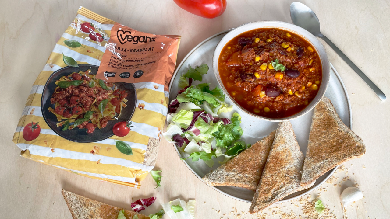 Chili sin CarneMit Veganz Soja-Granulat Es muss schnell gehen, einfach sein und sollte am besten nicht viel Abwasch hinterlassen? Dann ist das vegane One-Pot-Gericht Chili sin Carne mit dem Veganz Soja-Granulat perfekt für dich! Zusammen mit frischem Brot, Reis oder einfach pur wird dich dieses einfache, aber dennoch köstliche Rezept überzeugen. Gerichte aus einem Topf …genannt „One-Pot“ sind super, wenn es mal schnell gehen soll und du nach dem Essen keine Lust hast noch etliche Töpfe und Pfannen abzuwaschen. Für One-Pot-Rezepte eignen sich Nudel- oder Reisgerichte perfekt, aber auch für ein aromatisches Chili reicht ein großer Topf vollkommen aus. In dem folgenden Rezept zeigen wir dir eine Alternative zum Chili con Carne.. Dafür benutzen wir unser proteinreiches Veganz Soja-Granulat. Auf 100 g hat unsere Fleischalternative 50 g Protein! Das sind 30 g mehr Protein als in konventionellem Rinderhack. In Sachen Nachhaltigkeit ist das Veganz Soja-Granulat ein echter Streber. Für die große 500 g Variante werden nur 1.207 g Co2 produziert und 7 Liter Wasser verbraucht. Zum Vergleich: Für die gleiche Menge Rinderhack werden fast 8.000 Liter Wasser verbraucht und 5 kg CO2 produziert! Zutaten (4 Portionen) 200 g Veganz Soja-Granulat 500 g passierte Tomaten 400 g gestückelte Tomaten 400 g Kidney Bohnen 285 g Mais 2 Knoblauchzehen Eine große Zwiebel Öl, zum Anbraten 500 ml Gemüsebrühe 1 EL Tomatenmark 1 TL Salz 1 TL Pfeffer 1 EL Paprikapulver 1 TL Chilipulver Optional Brot oder Reis Portionen Portionen: Die Zwiebel und den Knoblauch klein schneiden und mit etwas Öl glasig anbraten. Anschließend das Veganz Soja-Granulat, Tomatenmark und die Paprika dazu geben und ebenfalls mit anbraten. Das Ganze mit der Gemüsebrühe ablöschen. Danach die passierten und stückigen Tomaten dazu geben und das Chili aufkochen lassen. Den Mais und die Kidneybohnen sowie die Gewürze dazu geben und das Chili sin Carne für weitere 20 Minuten köcheln lassen. Bei Bedarf in der Zwischenzeit Reis kochen oder Brot aufschneiden und zusammen mit dem Chili sin Carne servieren. Guten Appetit! Unsere Produkte für deine Rezeptkreation